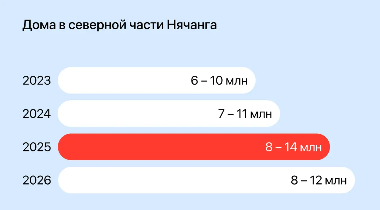За 2023–2025 годы в Нячанге появилось примерно 5 000–7 000 новых квартир, а также сотни частных домов. Но значительная часть нового предложения сосредоточена в одном и том же сегменте — проектах Mường Thanh