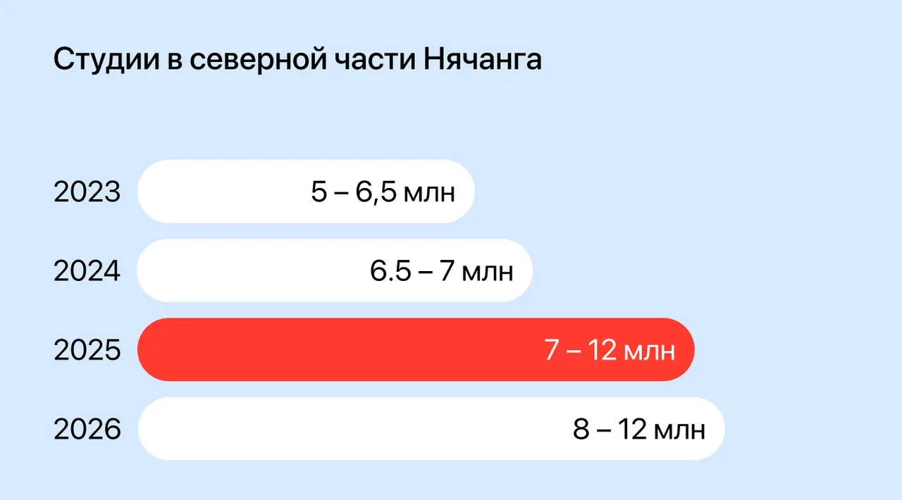 За три года студии здесь выросли в цене с 5–6,5 млн до 8–12 млн VND. Апартаменты с одной спальней поднялись с 6,5–8 млн до 8–12 млн VND