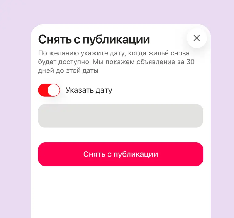 Если заранее известно, когда жильё освободится, не нужно держать это в голове и потом вручную возвращать объект в показ. Для этого мы и сделали отдельную опцию: можно снять объект с публикации, указать дату, до которой он занят, и сервис сам начнёт показывать объявление за 30 дней до освобождения